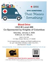 Local 488 and the Knights of Columbus from St. Jude's Parish will be hosting a co-sponsored Blood Drive on January 3, 2026 at the IBEW Local 488 Union Hall. Help save a life and sign up to donate.